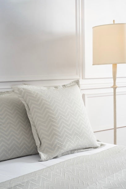 The Tiamo Silver Quit Collection is defined by special yarn dyed technique and sateen finish. Inspired by a classic infused triangular Jacquard motif. The organic cotton sateen fabrication ensures a silky, soft hand and a fluid drape. Sets comes with one Quit and two euro shams, a while single bed sets comes with one quilt and one sham.