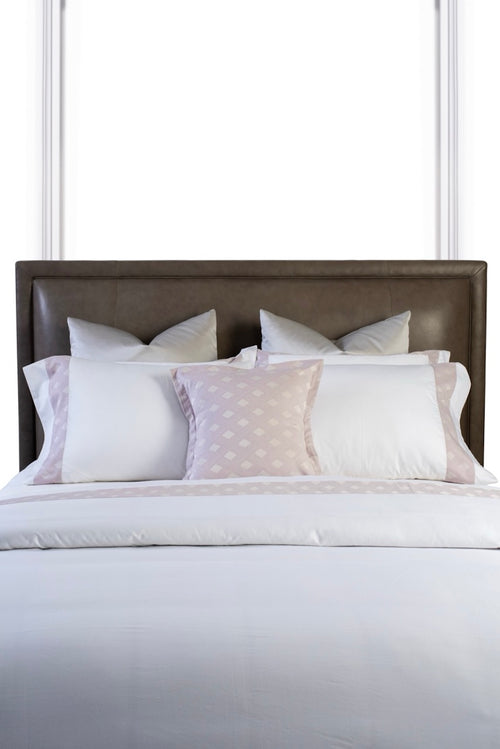 The La Rosa burgundy top sheet is defined by its two double oxford ruffle cut handmade style add to a sophisticated diamond Jacquard  motif to the base. The organic cotton sateen fabrication ensures a silky, soft hand and a fluid drape.