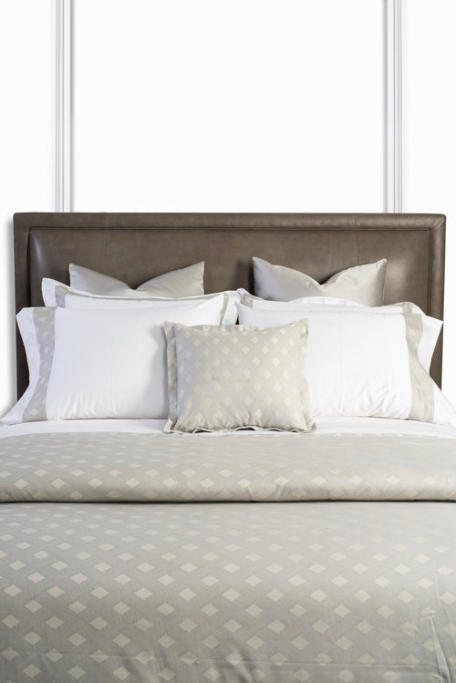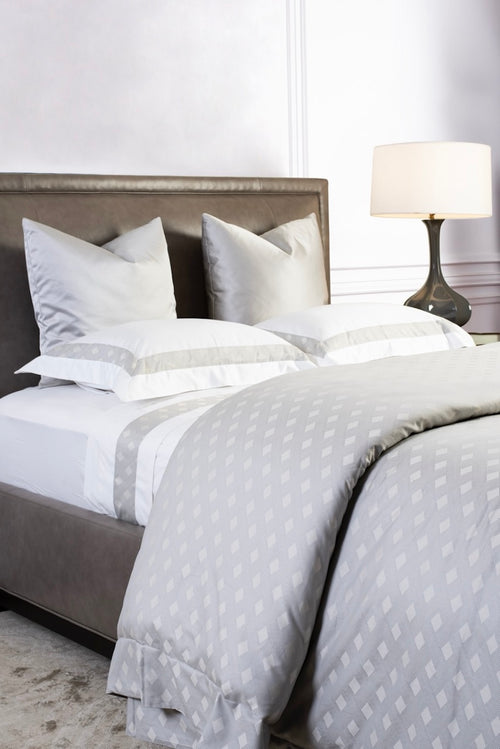 The La Rosa silver top sheet is defined by its two double oxford ruffle cut handmade style add to a sophisticated diamond Jacquard  motif to the base. The organic cotton sateen fabrication ensures a silky, soft hand and a fluid drape
